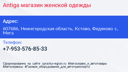 Antiga, магазин женской одежды по адресу 607686, Нижегородская область, Кстово, Федяково с, Мега в дальнейшем Организация, размещена в следующих категориях: