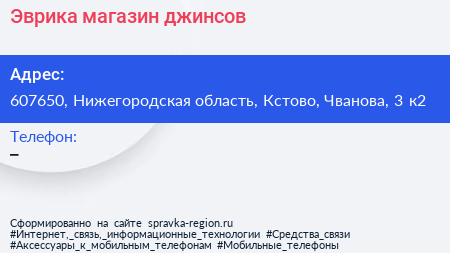 Эврика, магазин джинсов по адресу 607650, Нижегородская область, Кстово, Чванова, 3 к2 в дальнейшем Организация, размещена в следующих категориях: