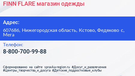 FINN FLARE, магазин одежды по адресу 607686, Нижегородская область, Кстово, Федяково с, Мега в дальнейшем Организация, размещена в следующих категориях: