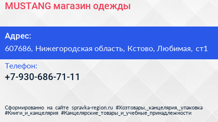 MUSTANG, магазин одежды по адресу 607686, Нижегородская область, Кстово, Любимая, ст1 в дальнейшем Организация, размещена в следующих категориях: