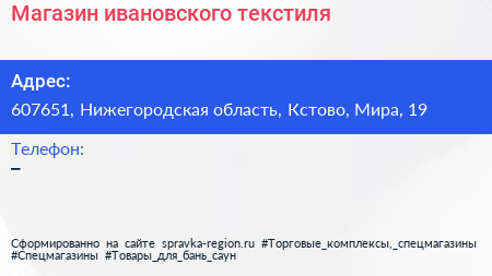 Магазин ивановского текстиля по адресу 607651, Нижегородская область, Кстово, Мира, 19 в дальнейшем Организация, размещена в следующих категориях:
