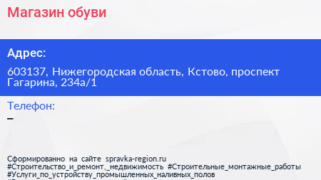 Магазин обуви по адресу 603137, Нижегородская область, Кстово, проспект Гагарина, 234а/1 в дальнейшем Организация, размещена в следующих категориях: