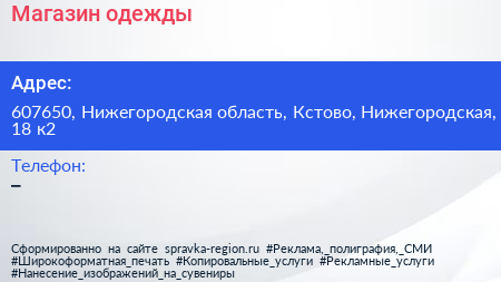Магазин одежды по адресу 607650, Нижегородская область, Кстово, Нижегородская, 18 к2 в дальнейшем Организация, размещена в следующих категориях: