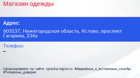 Магазин одежды по адресу 603137, Нижегородская область, Кстово, проспект Гагарина, 234а в дальнейшем Организация, размещена в следующих категориях: