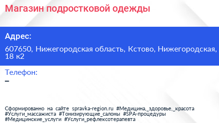 Магазин подростковой одежды по адресу 607650, Нижегородская область, Кстово, Нижегородская, 18 к2 в дальнейшем Организация, размещена в следующих категориях: