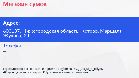 Магазин сумок по адресу 603137, Нижегородская область, Кстово, Маршала Жукова, 24 в дальнейшем Организация, размещена в следующих категориях: