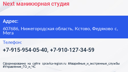 Next, маникюрная студия по адресу 607686, Нижегородская область, Кстово, Федяково с, Мега в дальнейшем Организация, размещена в следующих категориях: