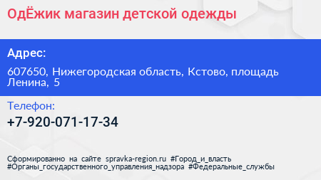ОдЁжик, магазин детской одежды по адресу 607650, Нижегородская область, Кстово, площадь Ленина, 5 в дальнейшем Организация, размещена в следующих категориях: