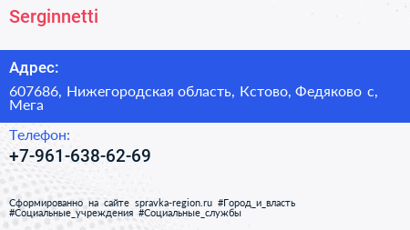 Serginnetti по адресу 607686, Нижегородская область, Кстово, Федяково с, Мега в дальнейшем Организация, размещена в следующих категориях: