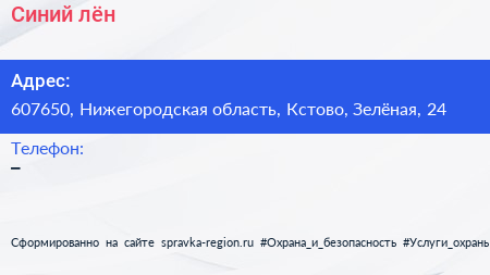 Синий лён по адресу 607650, Нижегородская область, Кстово, Зелёная, 24 в дальнейшем Организация, размещена в следующих категориях: