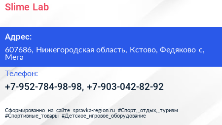Slime Lab по адресу 607686, Нижегородская область, Кстово, Федяково с, Мега в дальнейшем Организация, размещена в следующих категориях: