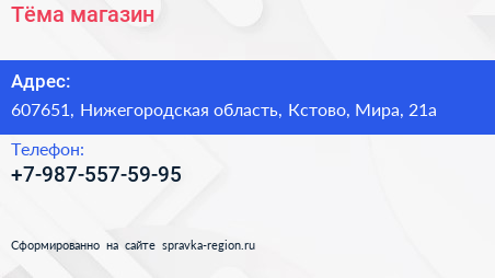 Тёма, магазин по адресу 607651, Нижегородская область, Кстово, Мира, 21а в дальнейшем Организация, размещена в следующих категориях: