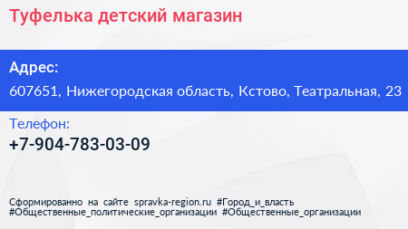 Туфелька, детский магазин по адресу 607651, Нижегородская область, Кстово, Театральная, 23 в дальнейшем Организация, размещена в следующих категориях: