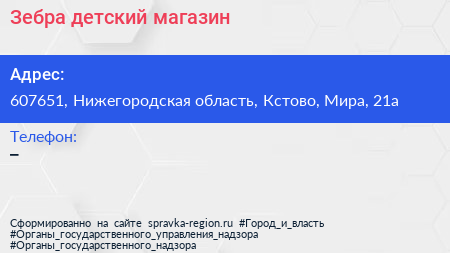 Зебра, детский магазин по адресу 607651, Нижегородская область, Кстово, Мира, 21а в дальнейшем Организация, размещена в следующих категориях: