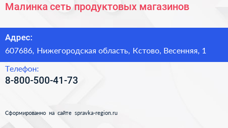 Малинка, сеть продуктовых магазинов по адресу 607686, Нижегородская область, Кстово, Весенняя, 1 в дальнейшем Организация, размещена в следующих категориях: