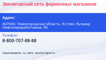 Звениговский, сеть фирменных магазинов по адресу 607660, Нижегородская область, Кстово, бульвар Нефтепереработчиков, 9Б в дальнейшем Организация, размещена в следующих категориях: