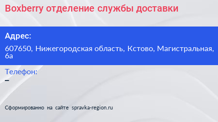 Boxberry, отделение службы доставки по адресу 607650, Нижегородская область, Кстово, Магистральная, 6а в дальнейшем Организация, размещена в следующих категориях: