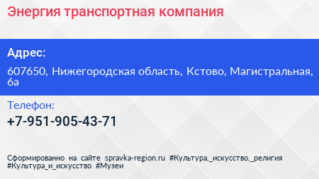 Энергия, транспортная компания по адресу 607650, Нижегородская область, Кстово, Магистральная, 6а в дальнейшем Организация, размещена в следующих категориях: