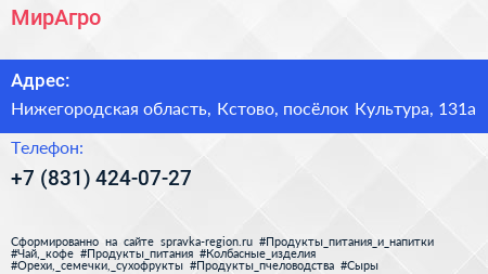 МирАгро по адресу Нижегородская область, Кстово, посёлок Культура, 131а в дальнейшем Организация, размещена в следующих категориях: