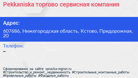 Pekkaniska, торгово-сервисная компания по адресу 607686, Нижегородская область, Кстово, Придорожная, 20 в дальнейшем Организация, размещена в следующих категориях: