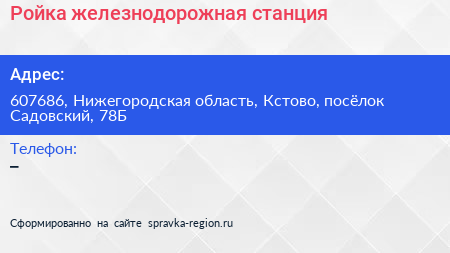 Ройка, железнодорожная станция по адресу 607686, Нижегородская область, Кстово, посёлок Садовский, 78Б в дальнейшем Организация, размещена в следующих категориях: