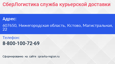 СберЛогистика, служба курьерской доставки по адресу 607650, Нижегородская область, Кстово, Магистральная, 22 в дальнейшем Организация, размещена в следующих категориях: