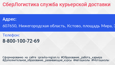 СберЛогистика, служба курьерской доставки по адресу 607650, Нижегородская область, Кстово, площадь Мира, 3 в дальнейшем Организация, размещена в следующих категориях: