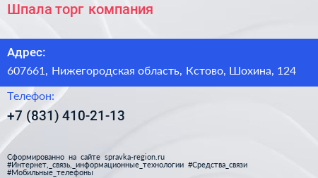 Для связи с организацией воспользуйтесь номером телефона: +7 (831) 410-21-13. Пн: c 08:00-19:00, Вт: c 08:00-19:00, Ср: c 08:00-19:00, Чт: c 08:00-19:00, Пт: c 08:00-19:00, Сб: выходной, Вс: выходной, вы можете обратиться в эту организацию.