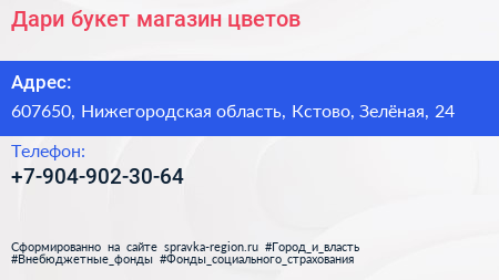 Дари букет, магазин цветов по адресу 607650, Нижегородская область, Кстово, Зелёная, 24 в дальнейшем Организация, размещена в следующих категориях: