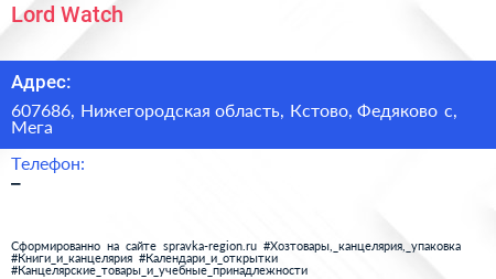 Lord+Watch по адресу 607686, Нижегородская область, Кстово, Федяково с, Мега в дальнейшем Организация, размещена в следующих категориях:
