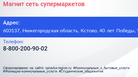 Магнит, сеть супермаркетов по адресу 603137, Нижегородская область, Кстово, 40 лет Победы, 9 в дальнейшем Организация, размещена в следующих категориях: