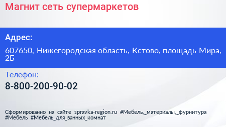 Магнит, сеть супермаркетов по адресу 607650, Нижегородская область, Кстово, площадь Мира, 2Б в дальнейшем Организация, размещена в следующих категориях: