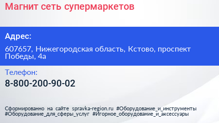Магнит, сеть супермаркетов по адресу 607657, Нижегородская область, Кстово, проспект Победы, 4а в дальнейшем Организация, размещена в следующих категориях: