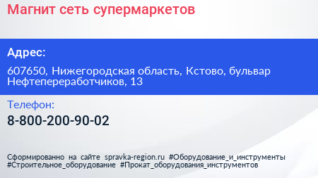 Магнит, сеть супермаркетов по адресу 607650, Нижегородская область, Кстово, бульвар Нефтепереработчиков, 13 в дальнейшем Организация, размещена в следующих категориях: