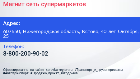 Магнит, сеть супермаркетов по адресу 607650, Нижегородская область, Кстово, 40 лет Октября, 25 в дальнейшем Организация, размещена в следующих категориях: