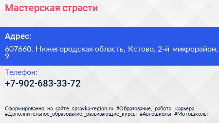 Мастерская страсти по адресу 607660, Нижегородская область, Кстово, 2-й микрорайон, 9 в дальнейшем Организация, размещена в следующих категориях: