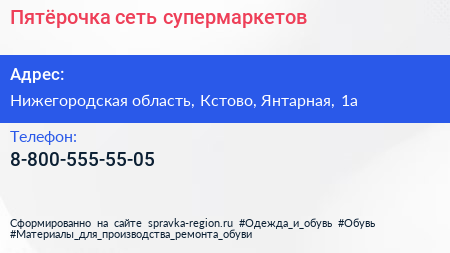 Пятёрочка, сеть супермаркетов по адресу Нижегородская область, Кстово, Янтарная, 1а в дальнейшем Организация, размещена в следующих категориях: