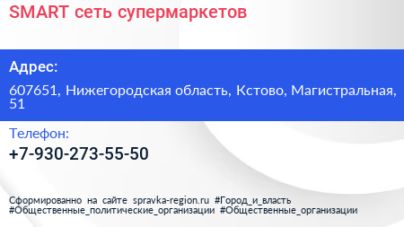 SMART, сеть супермаркетов по адресу 607651, Нижегородская область, Кстово, Магистральная, 51 в дальнейшем Организация, размещена в следующих категориях: