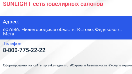SUNLIGHT, сеть ювелирных салонов по адресу 607686, Нижегородская область, Кстово, Федяково с, Мега в дальнейшем Организация, размещена в следующих категориях: