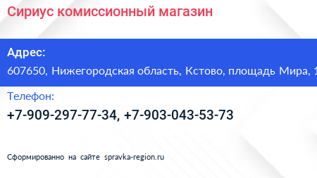 Сириус, комиссионный магазин по адресу 607650, Нижегородская область, Кстово, площадь Мира, 1 в дальнейшем Организация, размещена в следующих категориях:
