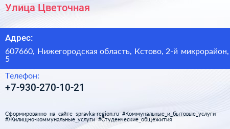 Улица Цветочная по адресу 607660, Нижегородская область, Кстово, 2-й микрорайон, 5 в дальнейшем Организация, размещена в следующих категориях: