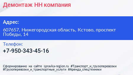 Демонтаж-НН, компания по адресу 607657, Нижегородская область, Кстово, проспект Победы, 14 в дальнейшем Организация, размещена в следующих категориях: