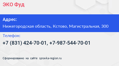ЭКО Фуд по адресу Нижегородская область, Кстово, Магистральная, 300 в дальнейшем Организация, размещена в следующих категориях: