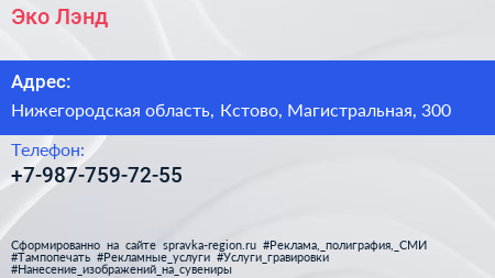 Эко Лэнд по адресу Нижегородская область, Кстово, Магистральная, 300 в дальнейшем Организация, размещена в следующих категориях: