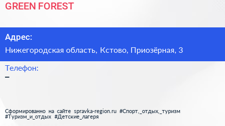 GREEN FOREST по адресу Нижегородская область, Кстово, Приозёрная, 3 в дальнейшем Организация, размещена в следующих категориях: