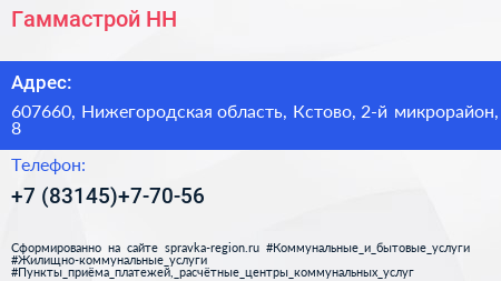 Гаммастрой НН по адресу 607660, Нижегородская область, Кстово, 2-й микрорайон, 8 в дальнейшем Организация, размещена в следующих категориях: