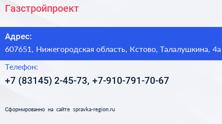 Газстройпроект по адресу 607651, Нижегородская область, Кстово, Талалушкина, 4а в дальнейшем Организация, размещена в следующих категориях: