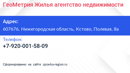 ГеоМетрия Жилья, агентство недвижимости по адресу 607676, Нижегородская область, Кстово, Полевая, 8а в дальнейшем Организация, размещена в следующих категориях: