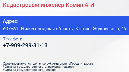 Кадастровый инженер Комин А.И. по адресу 607661, Нижегородская область, Кстово, Жуковского, 19 в дальнейшем Организация, размещена в следующих категориях: