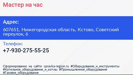 Мастер на час по адресу 607651, Нижегородская область, Кстово, Советский переулок, 6 в дальнейшем Организация, размещена в следующих категориях: